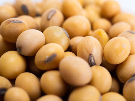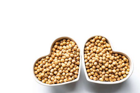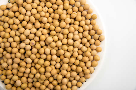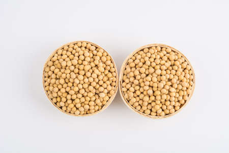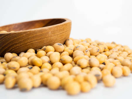 Close up shoot of soybeans on a wooden cup. Shoot on a white isolated background