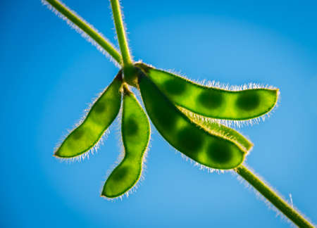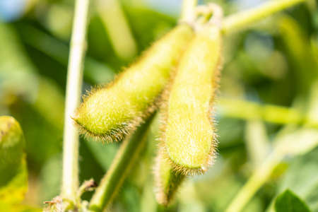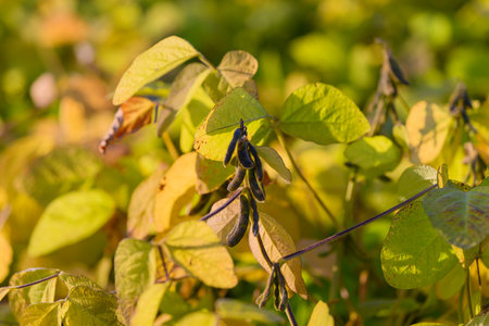 Soybean field in early fall ready for harvest, close up, selective focus, background blur, foreground blur