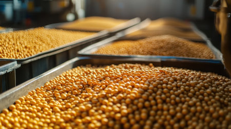 A vivid image showcasing a steel container pouring a mix of yellow and brown seeds onto a conveyor belt in a modern agricultural facility.