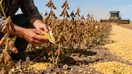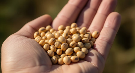 An AI generated illustration of a farmer holding a bunch of soybeans in his hands