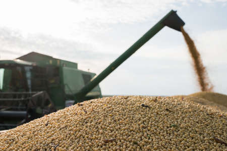 Soybeans during harvest, Detailed image capturing soybean field during harvest time, Closeup view illustrating soybean pods and plants illuminated at dusk in rural field