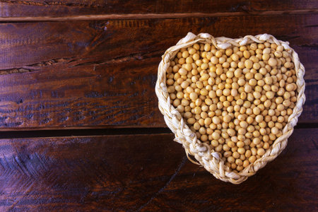 raw and fresh soy beans inside basket with heart shape on rustic wooden table