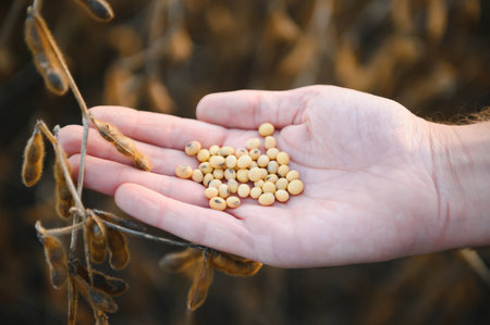Harvest ready soy bean cultivated agricultural field, organic farming soya plantation