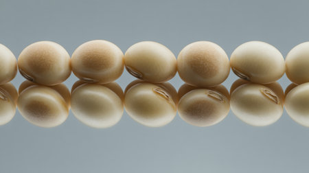 This image features a line of smooth, creamy eggs arranged neatly on a reflective surface, showcasing their natural beauty with exquisite detail and soft lighting.