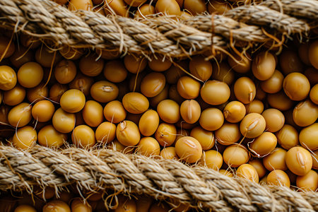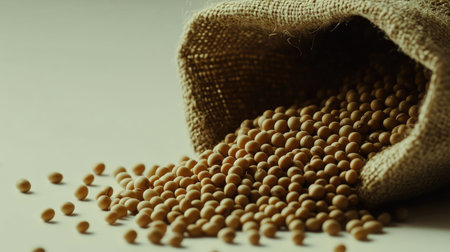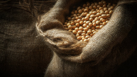 This image features rustic burlap sacks filled with raw yellow soybeans, highlighting the natural texture and earthy tones that enhance agricultural themes.
