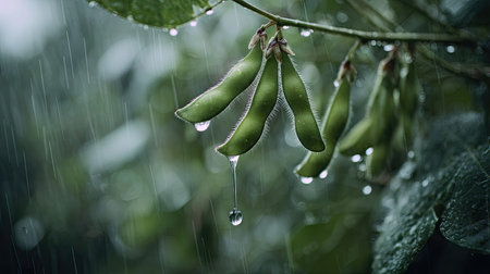 Soft rain falling gently on Edamame, with water droplets forming and slowly dripping. The background is softly blurred with a natural, moody atmosphere.