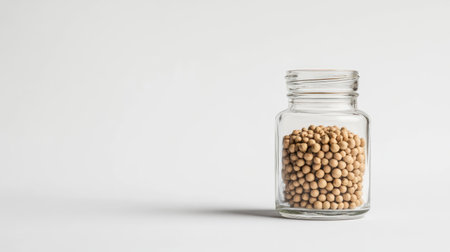 A clear glass jar filled with small yellow seeds, set against a minimalistic white background, perfect for concepts of health, food storage, and natural living.
