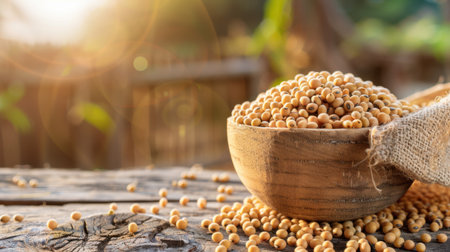 A rustic wooden bowl filled with fresh raw soybeans sits on a weathered wooden surface, surrounded by lush greenery and warm sunlight, perfect for healthy meal inspiration.