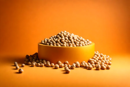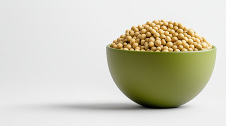 Soybeans in a ceramic bowl on a clean white surface, with subtle shadows enhancing their round shapes.
