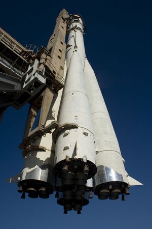 Nozzles of Vostok space booster rocket model against cloudy blue sky at VDNKh, Moscow. First Russian spaceship Vostok.
