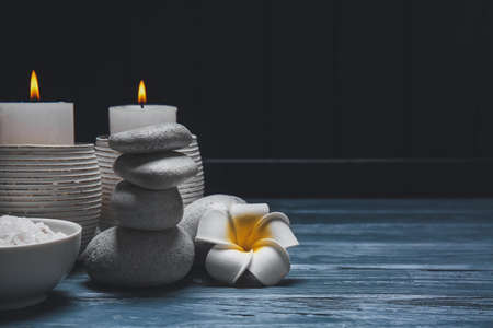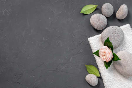 Spa background with spa accessories on a dark background, Zen stones., Spa Wellness Relax concept.