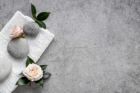 Spa and wellness setting with zen stones, shampoo, towel and flowers