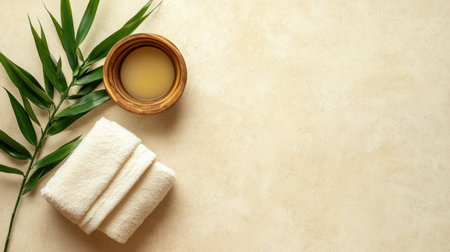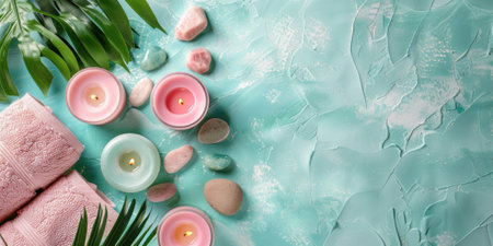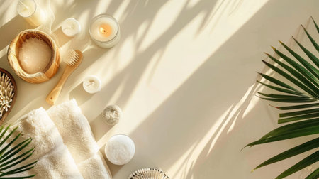 a flat lay photo of wellness aroma spa essentials, set against a template background, offering ample space for text or branding