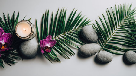 An overhead view displays a composed arrangement featuring a lit candle, purple orchids, smooth gray stones, and green palm fronds. The composition is set against a neutral background. The soft lighting and natural elements suggest a spa or wellness theme. Ideal for commercial applications related to tranquility and well-being.
