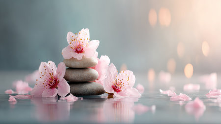 This image showcases a stack of grey stones topped with delicate pink flowers. The soft focus and bokeh effect in the background create a serene atmosphere. The composition utilizes shallow depth of field, with petals scattered. It's suitable for various commercial purposes, including wellness, nature and beauty content.