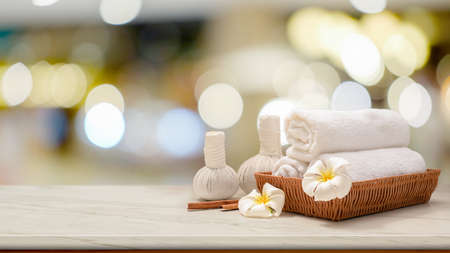 Spa treatment products on a marble tabletop with copy space for your product display against blurred bokeh background.