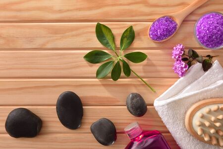 Massage and bath products on wooden table. Top view. Horizontal composition.