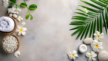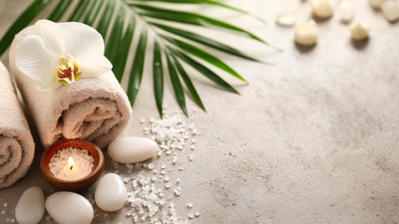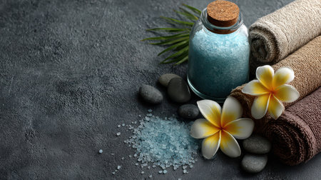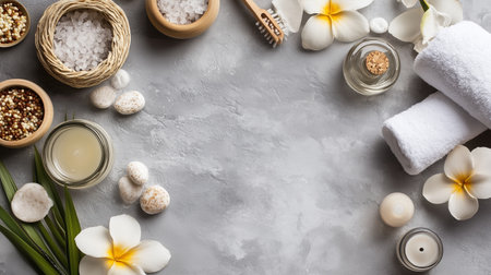 Relaxing spa setup with natural products, towels, flowers, and salt on a textured gray background