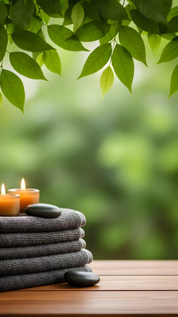 Relaxing spa elements with hot stones, candles, and fresh green leaves