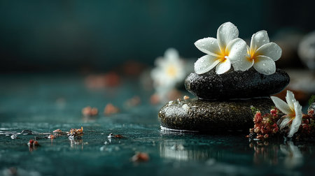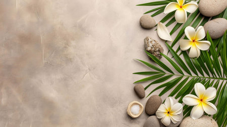 Spa treatment, tropical flowers, stones, relaxing scene.