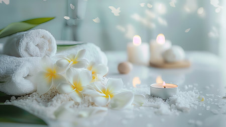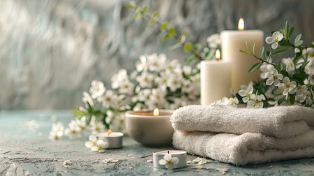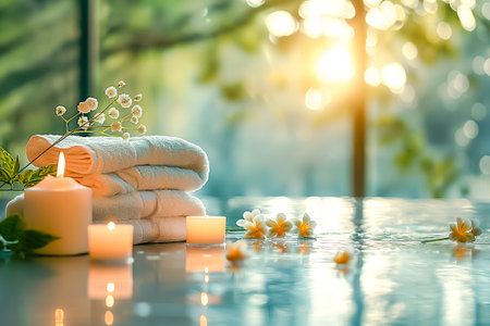 The serene spa environment features white towels stacked neatly beside glowing candles and delicate flowers, creating a peaceful atmosphere enhanced by gentle sunlight.