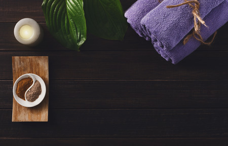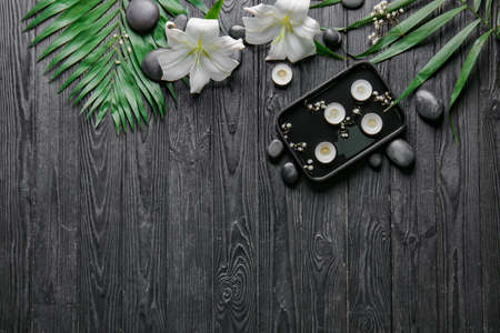 Spa Wellness Relax concept. Spa background with spa accessories on dark background. View from above with copy space.