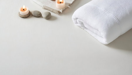 White showing spa massage stones, rolled towel, candle, and flower petals arranged on a neutral background keywords: spa, massage, stones, pebbles,...