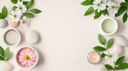 Serene spa flat lay with elegant containers, pebbles, and flowers on a neutral tone background