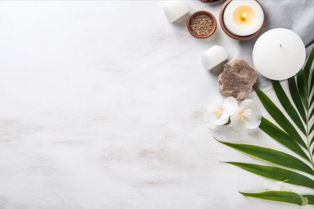 Spa concept on white stone background, tropical leaves, flowers, candle and zen like gray stones, top view, copy space. Time to relax, spa ritual.