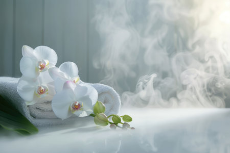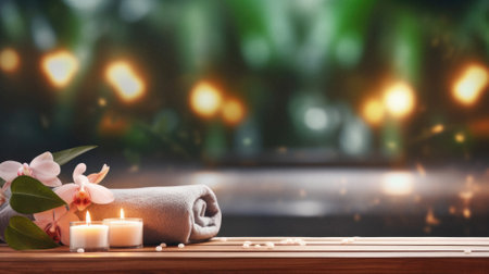 Opulent spa environment with orchids, towels, and candles. Luxurious and relaxing setting. Concept of wellness luxury, calming design, and elegant atmosphere. Banner. Copy space