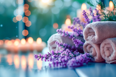 A calming spa setup features rolled towels, lavender flowers, and soft candles lit in a serene space, creating a peaceful atmosphere perfect for relaxation.