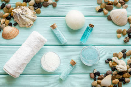 Spa treatments set with sea cosmetics - salt and aroma oil. Top view