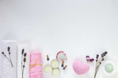Spa cosmetics and towels, dry lavender, aroma oils and sea salt on a white background
