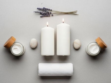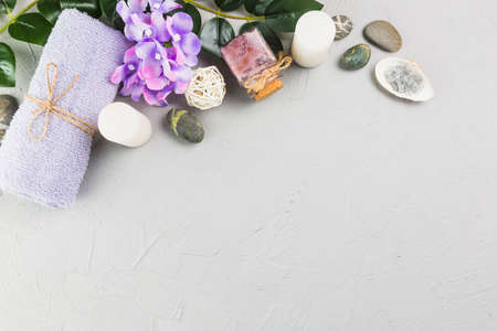 elevated view towel candles scrub bottle flowers spa stones grey backdrop. High quality photo