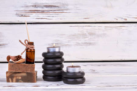 Spa still-life with stacked of stone and burning candles, close-up.