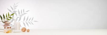 Spa still life with creams, essential oils, stones and towels on light background with shadow from plant. Healthy lifestyle, body care, Spa treatment.
