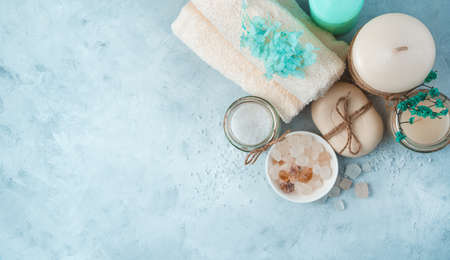 Spa set with care products on a soft blue background. Top view, panorama. The concept of spa treatments.