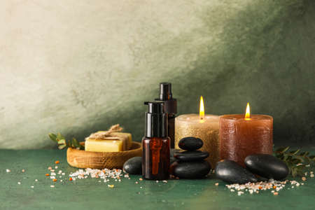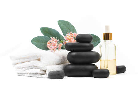 Spa and wellness massage setting. Still life with essential oil, salt and stones.