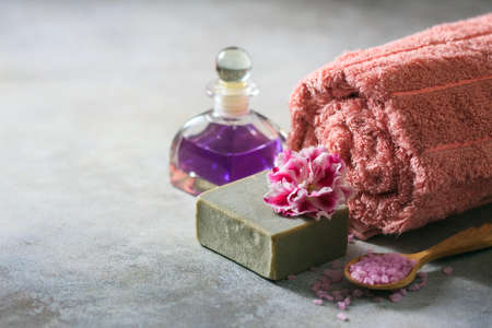 The concept spa. Handmade soap, towels, flowers and sea salt. Selective focus