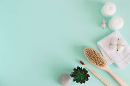 Various eco friendly spa treatment and wellness procucts. Different personal hygiene objects. Environmental awareness and beauty concept