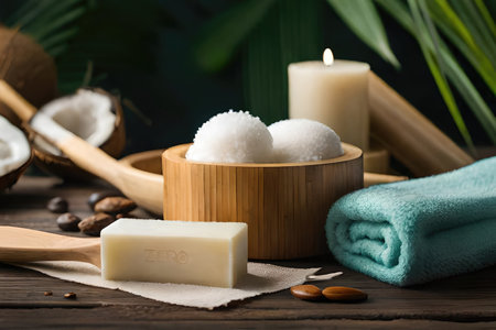 Spa ambiance featuring essential oil, organic soap, plush towel, and sea salt.