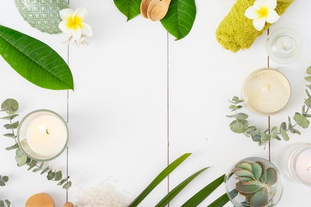 Spa card invitation with massage herbal ball,plumber flower in vase,coconut coffee soap,white towels and candle on white wood table background,soft white tone still life