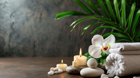 A serene spa arrangement featuring soft towels, glowing candles, and smooth stones invites relaxation and tranquility in a soothing environment. Perfect for wellness themes.