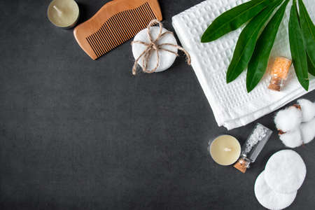 Natural body care cosmetics on concrete background. Spa accessories, towel, hairbrush, essential oil. Flat lay composition. Eco-friendly products, zero waste. Copy space.