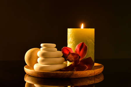 Tray with spa stones, candle and flower on dark background