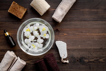 Bath in bowl with tropical flowers for foot spa, pumice stone, soap and oil on dark wooden background top view copyspace