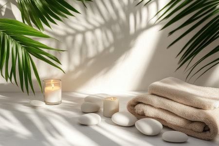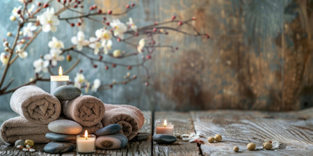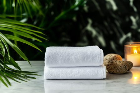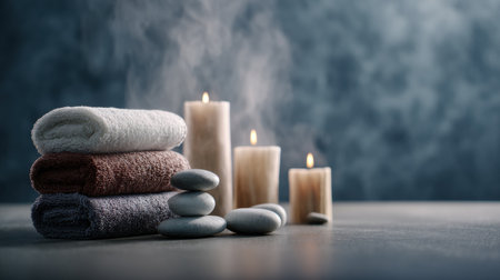 A serene spa arrangement featuring soft towels, glowing candles, and smooth stones invites relaxation and tranquility in a soothing environment. Perfect for wellness themes.