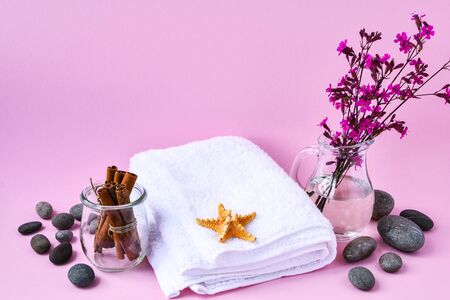 Spa still life treatment with candles, stones, sea shells starfish and towels on pink background, copy space for text