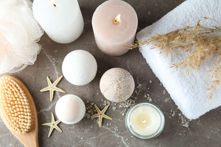 elevated view towel candles scrub bottle flowers spa stones grey backdrop. High quality photo