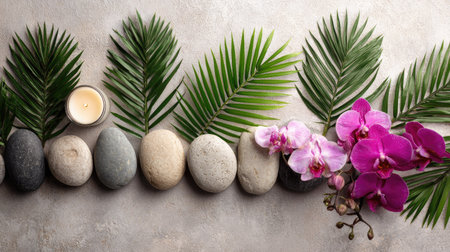 An overhead arrangement presents smooth gray stones and vibrant orchids with palm leaves. A small jar of cream sits near the rocks. The composition features a natural aesthetic and soft lighting, ideal for wellness, beauty, or relaxation themes. This image could be used for lifestyle or commercial applications.